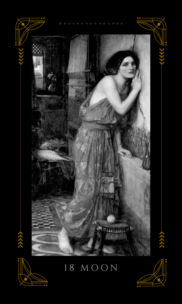 Confusion, deceits, moodiness, anxiety, fear, lack of clarity, darkness, illusions, the unseen, imaginings, 28-day cycles, mother figures, travel on or near water, and, when reversed, clarity or madness